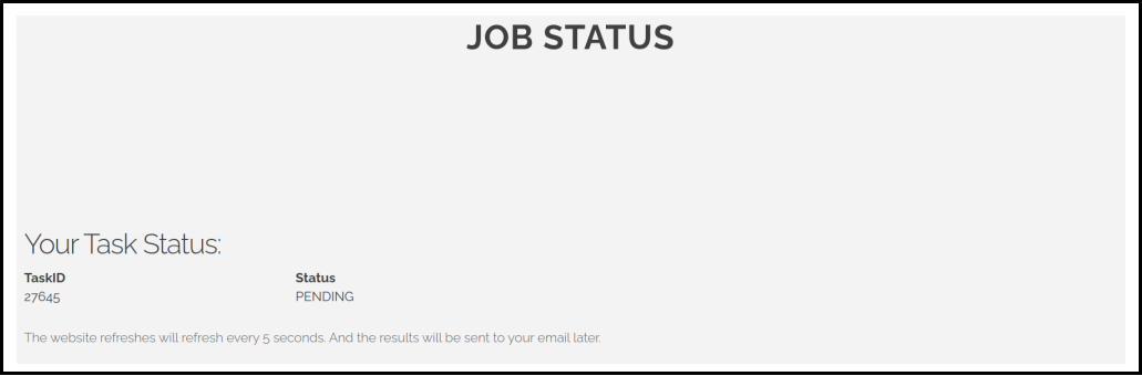 This page will refresh every 5 seconds until the task is completed, then it will automatically redirect to the RESULTS page.